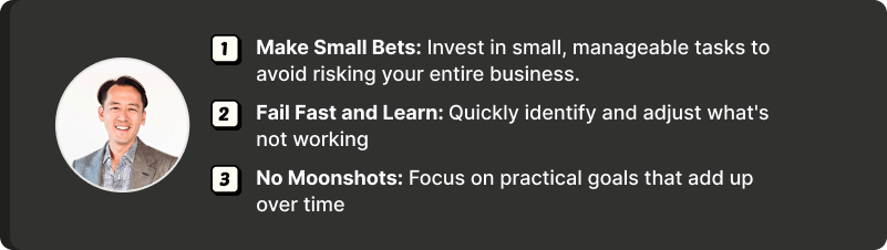 `Make small bets, fail fast and recalibrate, do not aim for moonshots as they are expensive!`