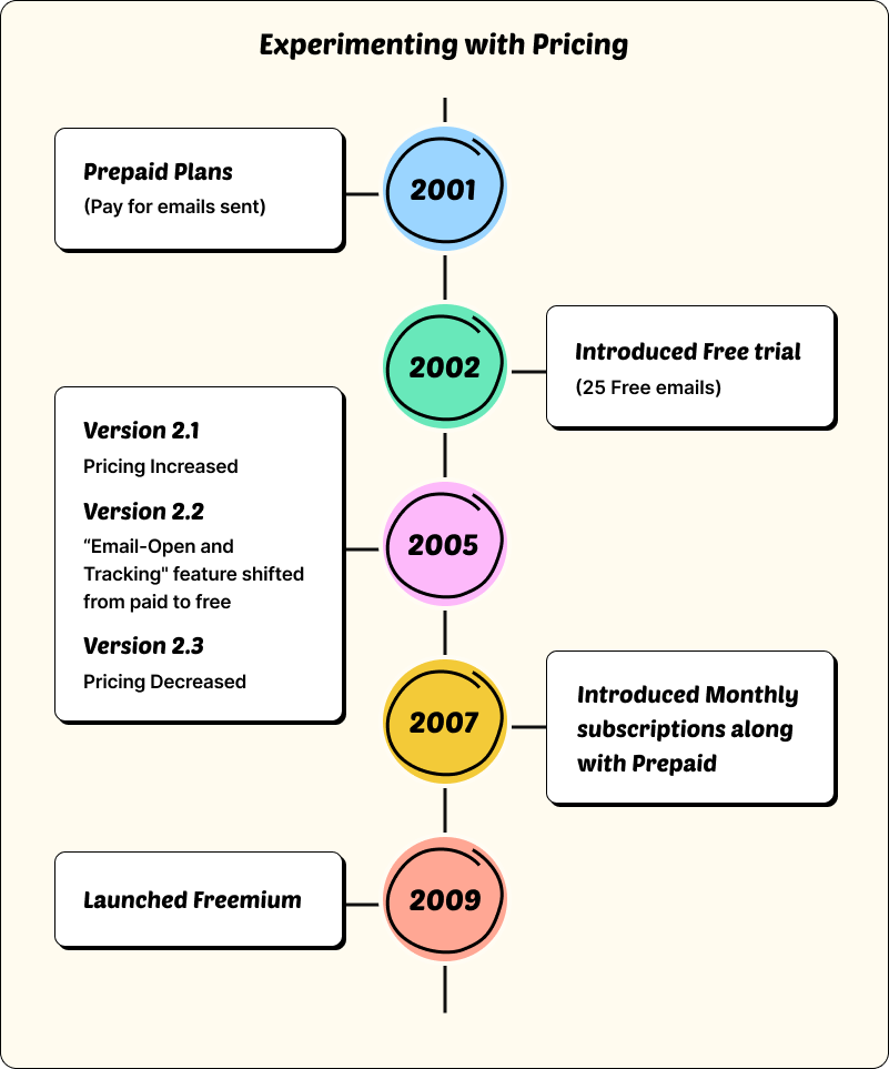 But Mailchimp didn’t suddenly wake up one day and decide to offer free plans to the world. It wasn’t a spur-of-the-moment choice, but a result of continuous tinkering with the pricing.