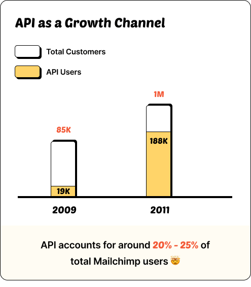 Indeed, that’s the scenario with MailChimp. In just 2 years, their API user count went from 19K to 188K—a whopping 889% increase!