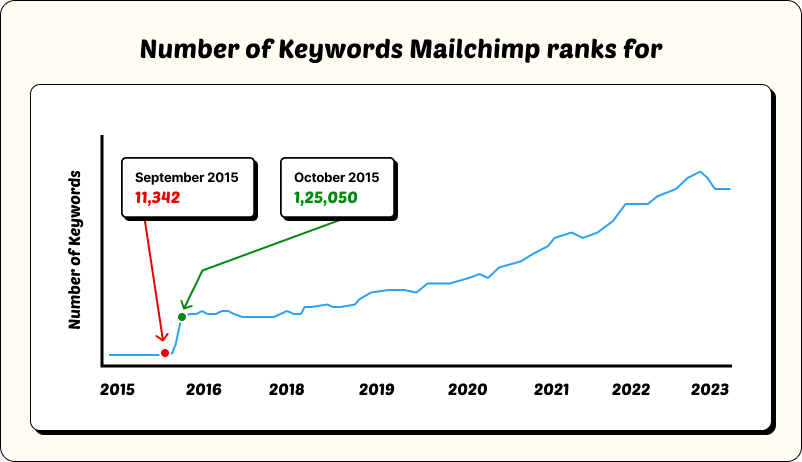 We contemplate that Mailchimp’s significant increase in organic traffic correlates with its major focus on SEO from October 2015. It yielded them a dramatic increase in keyword rankings, from 11,341 to 125,050 keywords in a single month!
