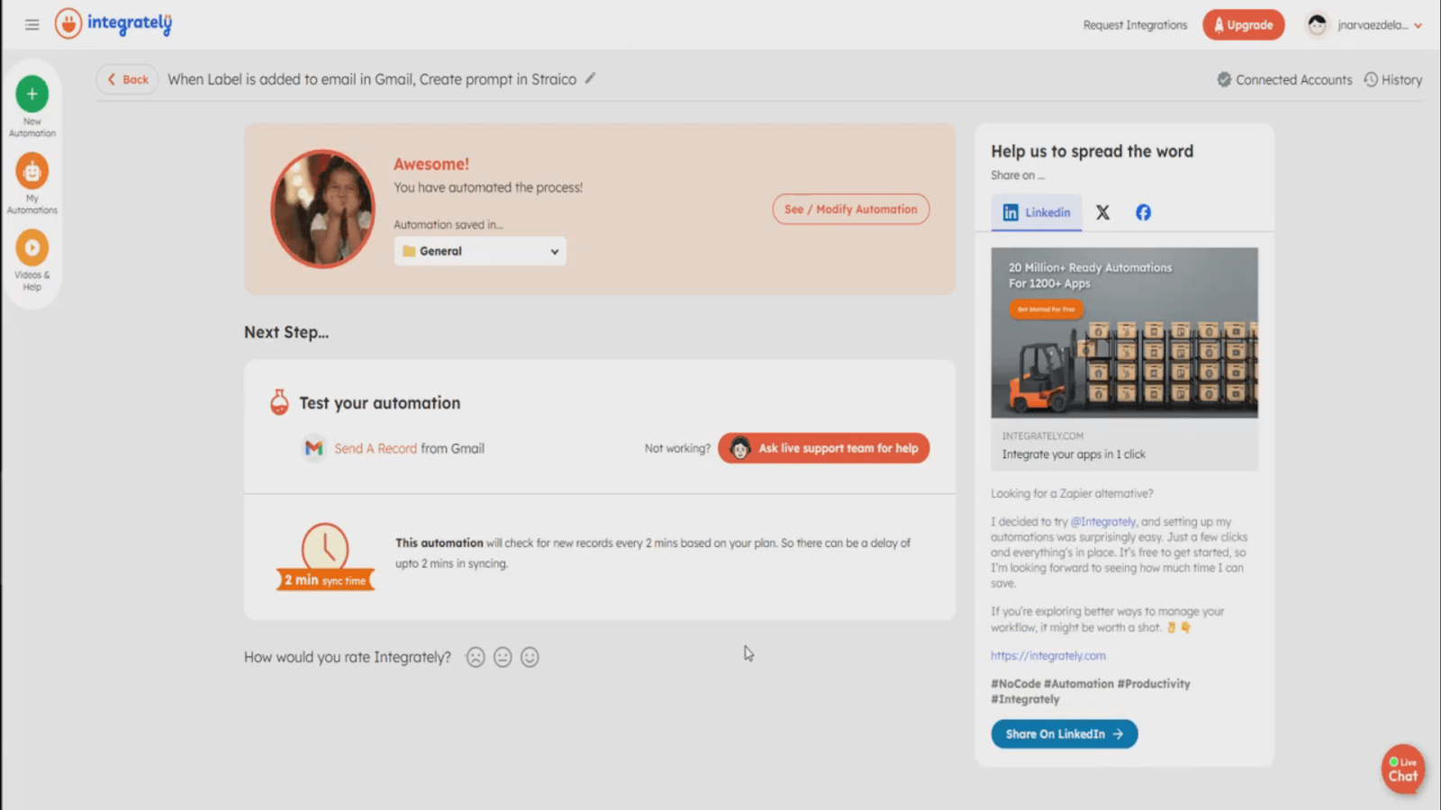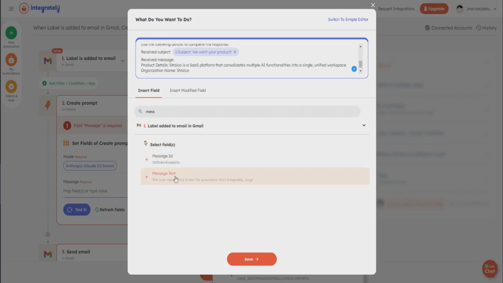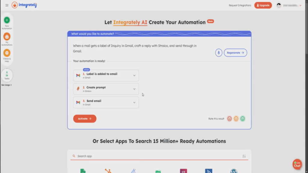 1. Integrately’s AI helps streamline setup by guiding you through each step of the automation. In this example, we’ll design an automation that revolves around managing inquiries using Gmail and crafting replies with the help of Straico. When an email is labeled ‘Inquiry’ in Gmail, Straico crafts a reply, which is then sent through Gmail.. Review the generated steps to ensure they align with your needs.