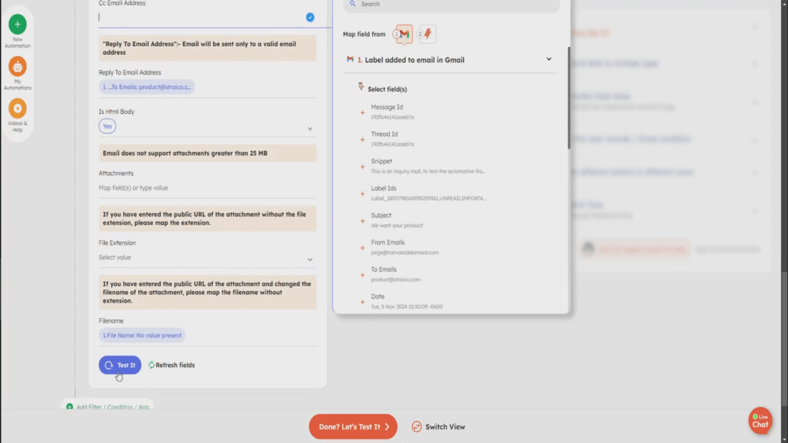 9. In the following block, you will integrate the output with other necessary details to send the email; remember to check that the “Is HTML Body” option is selected, which is crucial for proper formatting. Finally, click the button that says, “Done? Let’s Test It!” If you haven’t tested each step individually, you can opt to test everything or just the incomplete steps.