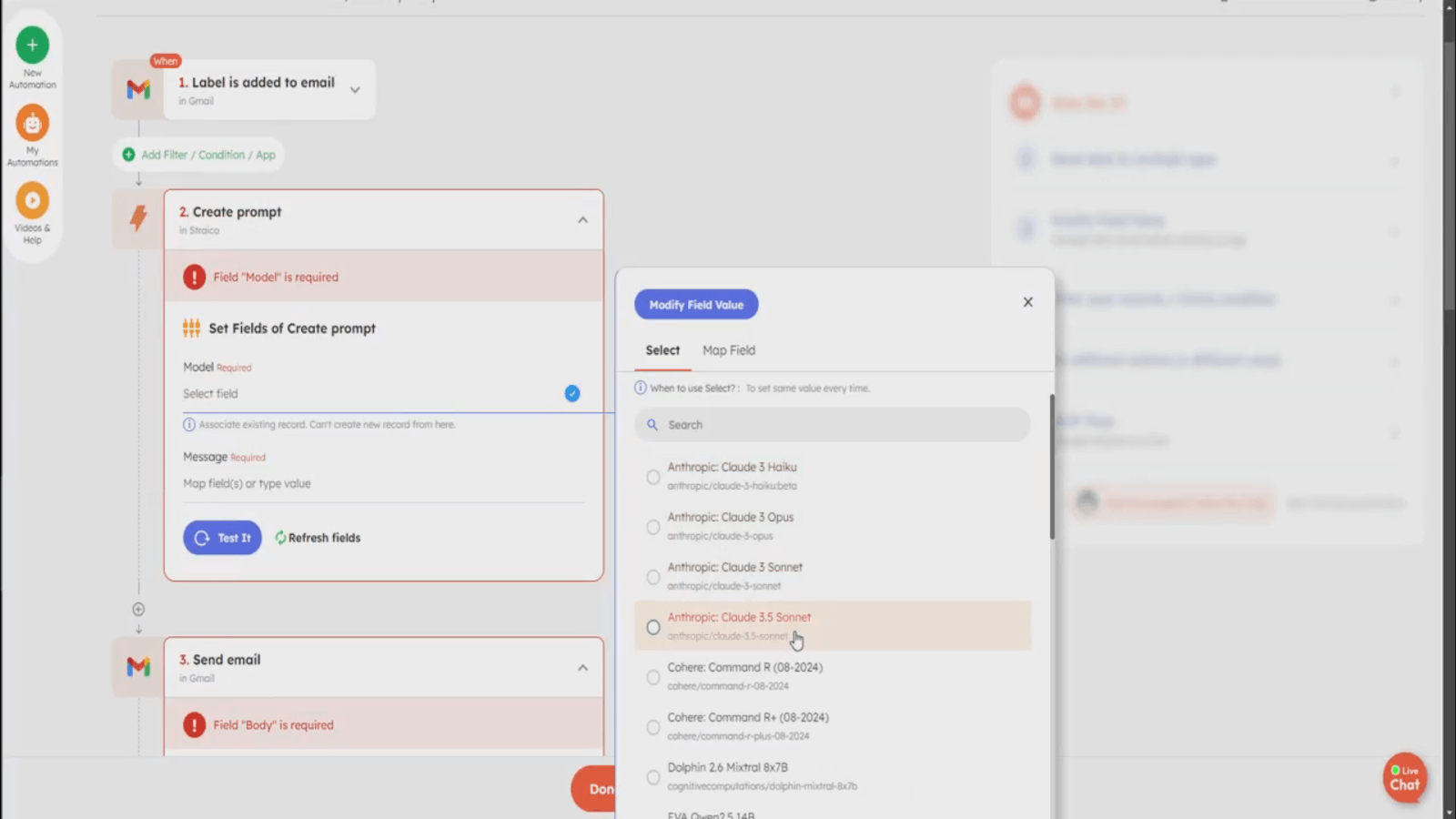7. In the Straico block of your automation, select the model you’ll be using. For this example, we’ll go with Claude 3.5 Sonnet by Anthropic, which is well-regarded for its output quality and cost-effectiveness. This choice works wonderfully for maintaining a professional tone in customer communications.